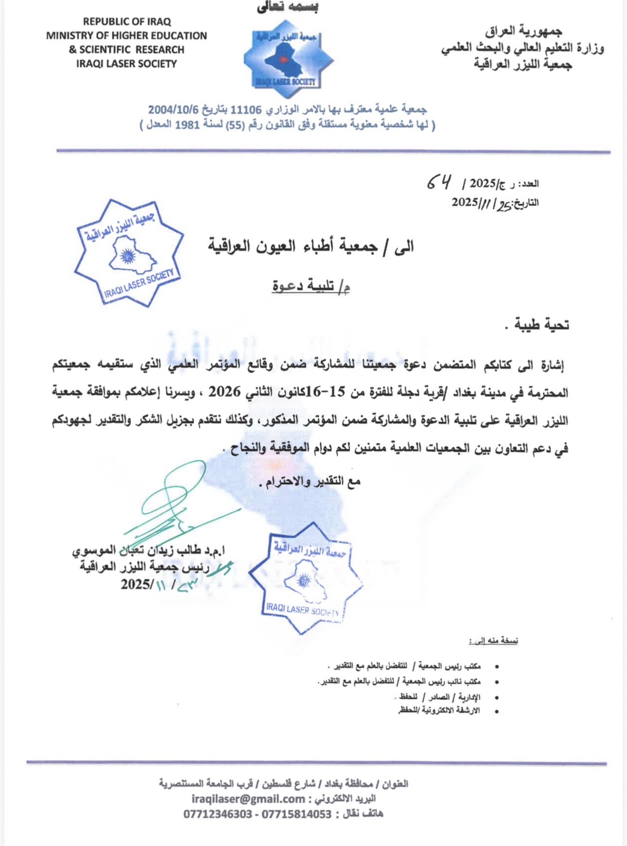 إنا لله وإنا اليه راجعون ببالغ الحزن والاسى تنعي جمعية الليزر العراقية أحد كوادرها الادارية الشهيد الاستاذ الدكتور اياد زوين وهو استاذ في الجامعة التكنلوجية قسم هندسة الليزر والالكترونيات البصرية عضو الهيئة الادارية في جمعية الليزر العراقية ؛
